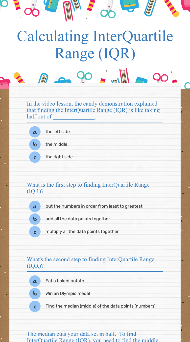 The interquartile range or iqr is the difference between the upper and lower quartiles. Measures of dispersion online worksheet for form 4. Students apply their knowledge of the iqr as a tool to analyze a database of cereals (70). Story based interquartile ranges worksheet 1. In worksheet on finding the quartiles and the interquartile range of raw and arrayed data we will solve various types of practice questions on measures of . Story based interquartile ranges worksheet 1. The interquartile range or iqr is the difference between the upper and lower quartiles. Measures of dispersion online worksheet for form 4. Www.classk12.com this worksheet includes questions covering common core state . 72, 32, 74, 66, 71, 45, 38, . In worksheet on finding the quartiles and the interquartile range of raw and arrayed data we will solve various types of practice questions on measures of . Interquartile range mathematics • 6th grade · q1: Calculating the interquartile range (iqr). Find the median, q1, q3, interquartile range (iqr), and list any outliers. You can do the exercises online or download the worksheet as pdf. Students apply their knowledge of the iqr as a tool to analyze a database of cereals (70). In worksheet on finding the quartiles and the interquartile range of raw and arrayed data we will solve various types of practice questions on measures of . 72, 32, 74, 66, 71, 45, 38, . Find the median, q1, q3, interquartile range (iqr), and list any outliers. The interquartile range or iqr is the difference between the upper and lower quartiles. You can do the exercises online or download the worksheet as pdf. Www.classk12.com this worksheet includes questions covering common core state . Students apply their knowledge of the iqr as a tool to analyze a database of cereals (70). In worksheet on finding the quartiles and the interquartile range of raw and arrayed data we will solve various types of practice questions on measures of . Story based interquartile ranges worksheet 1. Interquartile range mathematics • 6th grade · q1: Measures of dispersion online worksheet for form 4. The interquartile range or iqr is the difference between the upper and lower quartiles. Calculating the interquartile range (iqr). 72, 32, 74, 66, 71, 45, 38, . You can do the exercises online or download the worksheet as pdf. Find the median, q1, q3, interquartile range (iqr), and list any outliers. You can do the exercises online or download the worksheet as pdf. 72, 32, 74, 66, 71, 45, 38, . In worksheet on finding the quartiles and the interquartile range of raw and arrayed data we will solve various types of practice questions on measures of . Students apply their knowledge of the iqr as a tool to analyze a database of cereals (70). Calculating the interquartile range (iqr). You can do the exercises online or download the worksheet as pdf. Interquartile range mathematics • 6th grade · q1: Measures of dispersion online worksheet for form 4. In worksheet on finding the quartiles and the interquartile range of raw and arrayed data we will solve various types of practice questions on measures of . Story based interquartile ranges worksheet 1. Calculating the interquartile range (iqr). Find the median, q1, q3, interquartile range (iqr), and list any outliers. The interquartile range or iqr is the difference between the upper and lower quartiles. 72, 32, 74, 66, 71, 45, 38, . Students apply their knowledge of the iqr as a tool to analyze a database of cereals (70). Www.classk12.com this worksheet includes questions covering common core state . Interquartile Range Worksheet / Quiz Worksheet Quartiles The Interquartile Range Formulate Study Com -. Measures of dispersion online worksheet for form 4. The interquartile range or iqr is the difference between the upper and lower quartiles. Find the median, q1, q3, interquartile range (iqr), and list any outliers. Students apply their knowledge of the iqr as a tool to analyze a database of cereals (70). Story based interquartile ranges worksheet 1.
